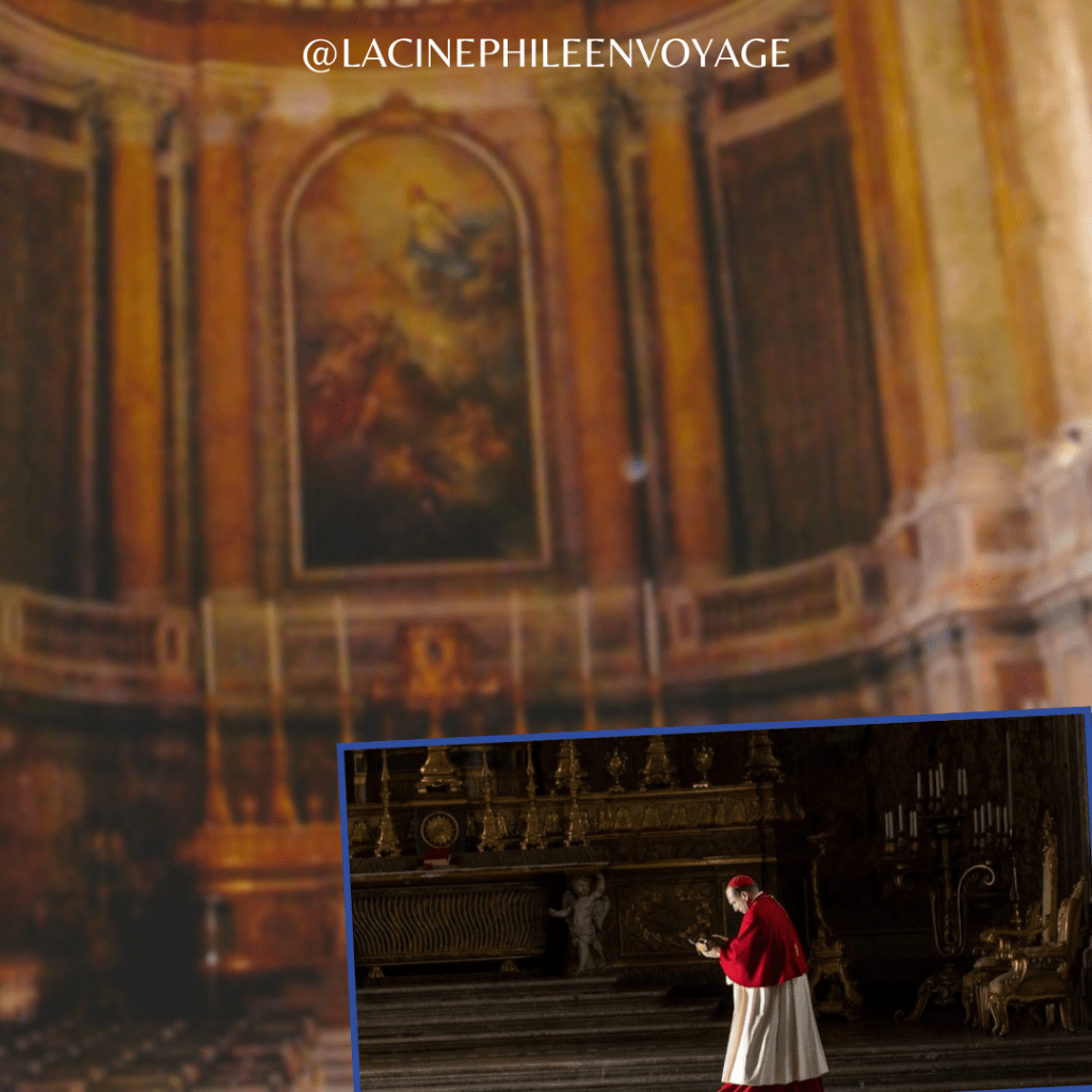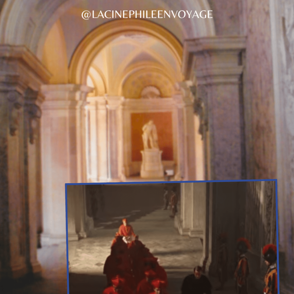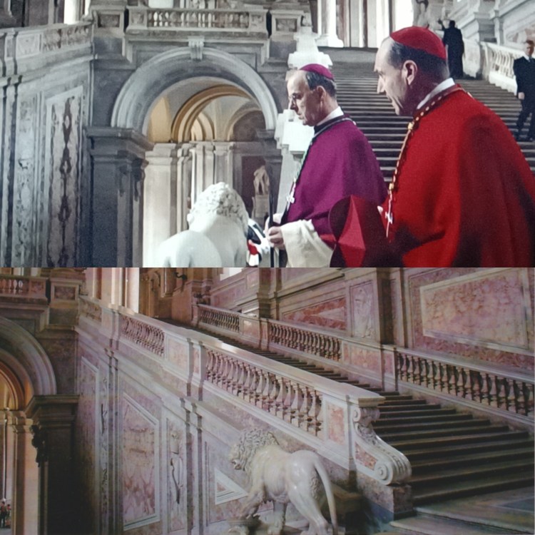 De nouveau, le Vatican étant toujours interdit d’accès pour les tournages – on s’en doute – mis à part une certaine zone de la fameuse Place Saint-Pierre délimitée par une marque au sol, la plus grosse partie du film s’est donc tournée au sein de l’historique studio Cinecittà de Rome, là où une copie quasi conforme de la Chapelle Sixtine a été reconstituée pour le film. Mais lorsque des décors plus authentiques sont nécessaires, c’est encore une fois le Palais de Caserte qui est sollicité. Rien que dans la bande annonce, on peut reconnaître les mêmes endroits déjà vus dans les films précités : le vestibule, l’escalier d’honneur tout de marbre rose, la chapelle Palatine, la cour intérieure…