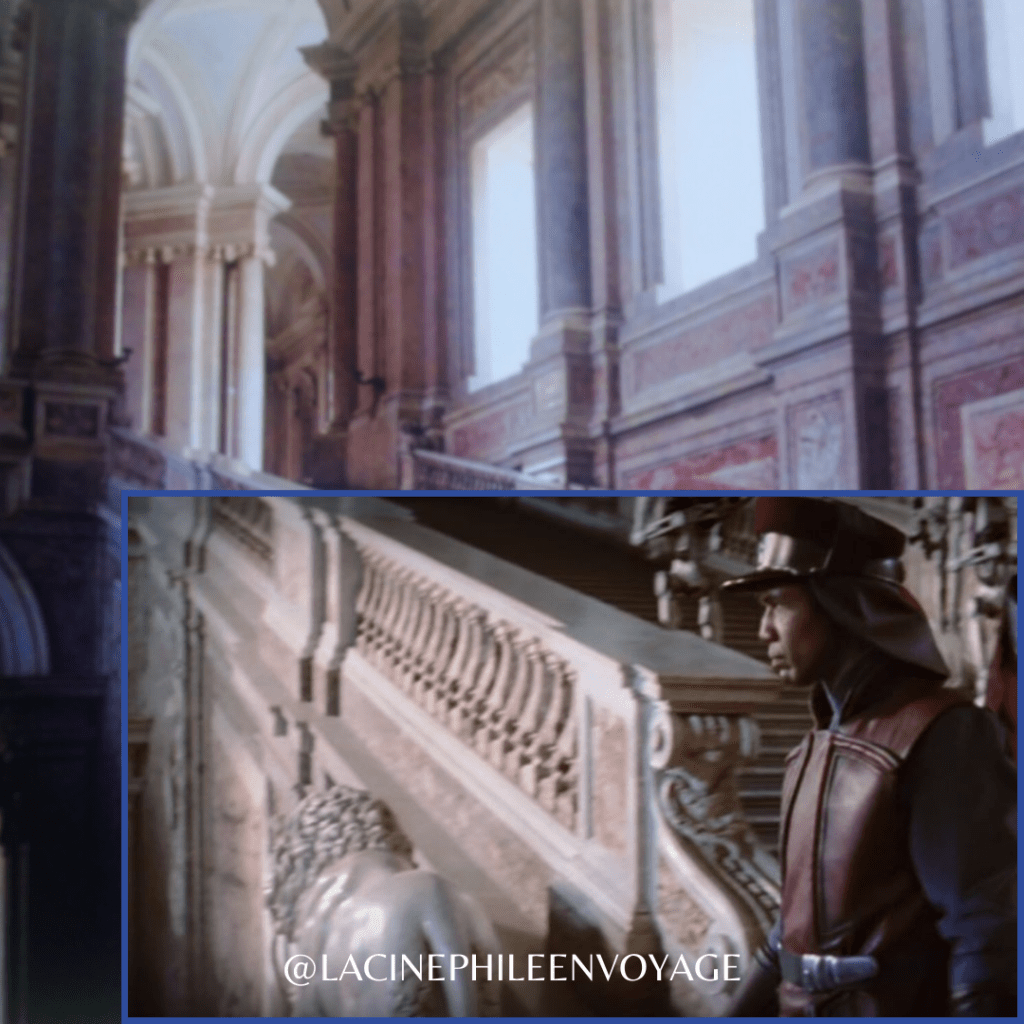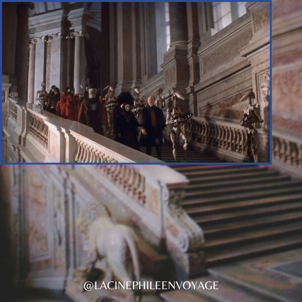 - Mais le film qui a définitivement mis Caserte à l’avant-plan depuis ces vingt dernières années, et boosta ainsi le tourisme du lieu, est un film de science-fiction qui relança la machine Star Wars en 1999: l’Episode I – La Menace Fantôme, écrit et réalisé par George Lucas, sorti 16 ans après le dernier film de la première trilogie dite « classique ». Le palais italien y double celui de la planète Naboo sur laquelle règne la jeune Padmé Amidala (Natalie Portman). Que ce soit ses murs de marbre rose, son escalier monumental avec la statue d’un lion, ou cette gigantesque fenêtre devant laquelle la reine tient conférence virtuelle avec le sénateur Palpatine, tout était déjà en place pour représenter un joyau architectural qui n’eût pas besoin d’ajouts numériques pour une fois dans la célèbre saga de « space opera ».