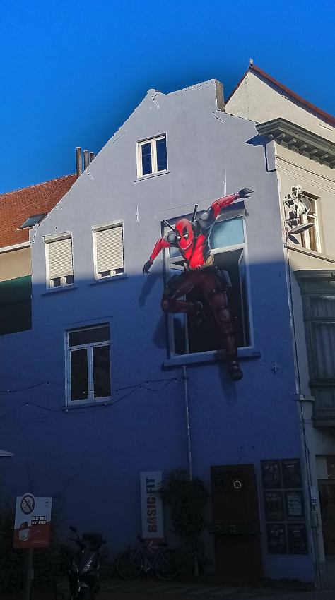 Toujours sur la Sint–Pietersnieuwstraat, vous tomberez peut-être encore sur la grande fresque qui représente Deadpool, cet anti-héros des comics Marvel interprété par Ryan Reynolds au cinéma et qui a eu les honneurs de ce mur du quartier estudiantin afin de célébrer l’arrivée de la plateforme de streaming Disney+ en Belgique en 2020. Cette façade est régulièrement réutilisée pour de nouvelles fresques, Deadpool s’y trouvait encore lors de mon dernier passage en octobre 2021.