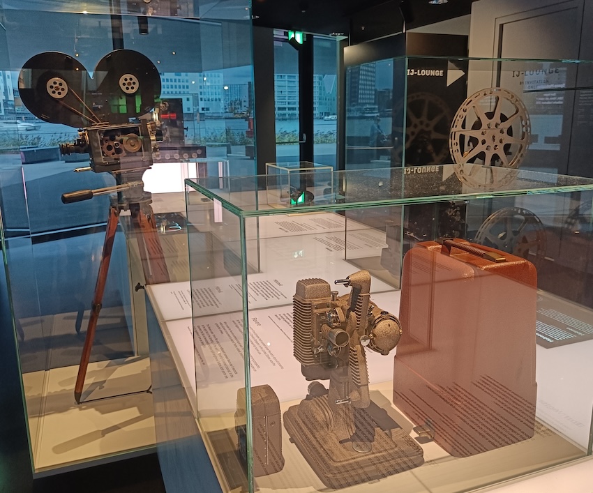 Quelques pièces de la collection du musée du cinéma d’Amsterdam; Cabine de diffusion de films de la cinémathèque avec quiz cinéma.