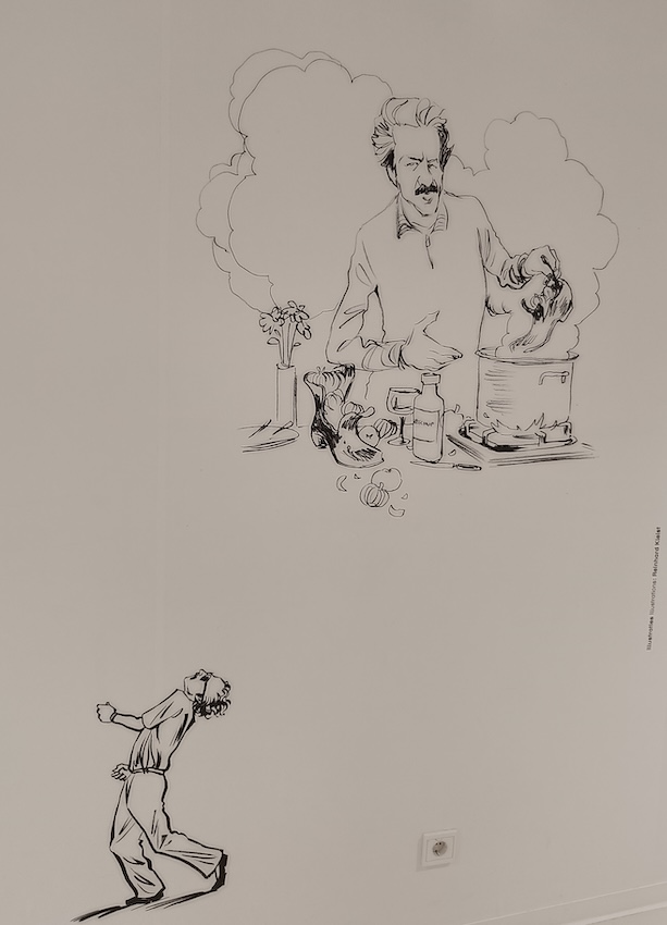 On pouvait aussi voir les affiches des films du réalisateur et un mur était occupé par les caricatures créées par l’illustrateur allemand Reinhard Kleist qui reprennent des moments clés de la carrière de Werner Herzog : les disputes violentes avec Kinski, la fois où il a cuisiné ses chaussures après avoir perdu un pari, l’ours du documentaire Grizzly Man, etc.