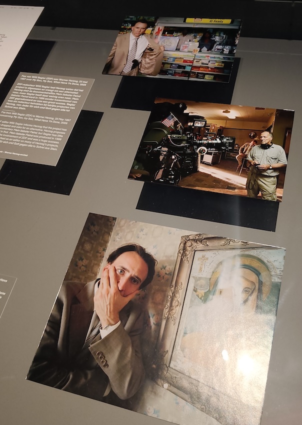 Montée en collaboration avec la Deutsche Kinemathek de Berlin, l’expo présentait également via de multiples écrans disposés sur le parcours des extraits de ses films et documentaires parmi les plus célèbres, donnant un caractère immersif à la visite. Le tournage du film Fitzcarraldo, sorti en 1982 après plusieurs années de travail en Amérique du Sud, a été particulièrement bien documenté, d’ailleurs il a donné lieu à un documentaire de type « making of » sous le titre Burden of Dreams qui rend bien compte des difficultés rencontrées sur ce film, un pari fou à la base où la mégalomanie du personnage principal joué par Klaus Kinski (et celle bien connue de l’acteur) ne fait que refléter celle du réalisateur. Collaborateurs de longue date – ils ont tourné cinq films ensemble de Aguirre la colère des Dieux à Cobra Verde en passant par le remake de Nosferatu avec Isabelle Adjani – les deux hommes avaient une relation complexe passant du respect total à la haine en bonne et due forme, leurs luttes de pouvoir ont fait les choux gras de la presse et ont inspiré à Werner Herzog le documentaire Ennemis intimes sorti en 1999.