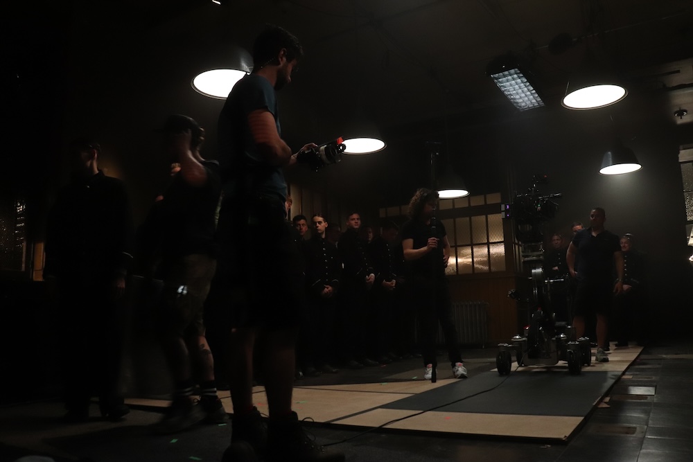 Vous pouvez voir sur les photos ci-dessus la mise en place de la caméra principale avec tous les techniciens et les acteurs qui se préparent pour la scène, on peut voir les marques au sol où ceux-ci doivent se tenir pour être dans le cadre.