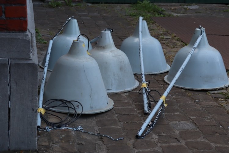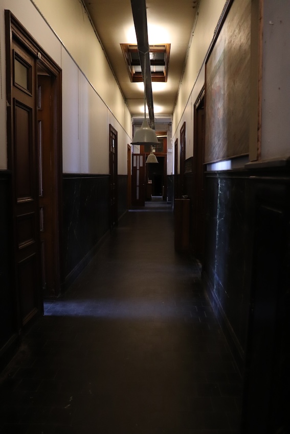 Dans cette salle, tout le mobilier a été déplacé pour le tournage, les signes de modernité camouflés et les lumières ont été remplacées par des lampes suspendues qui ne dénoteraient pas de nos jours dans un intérieur de style industriel.