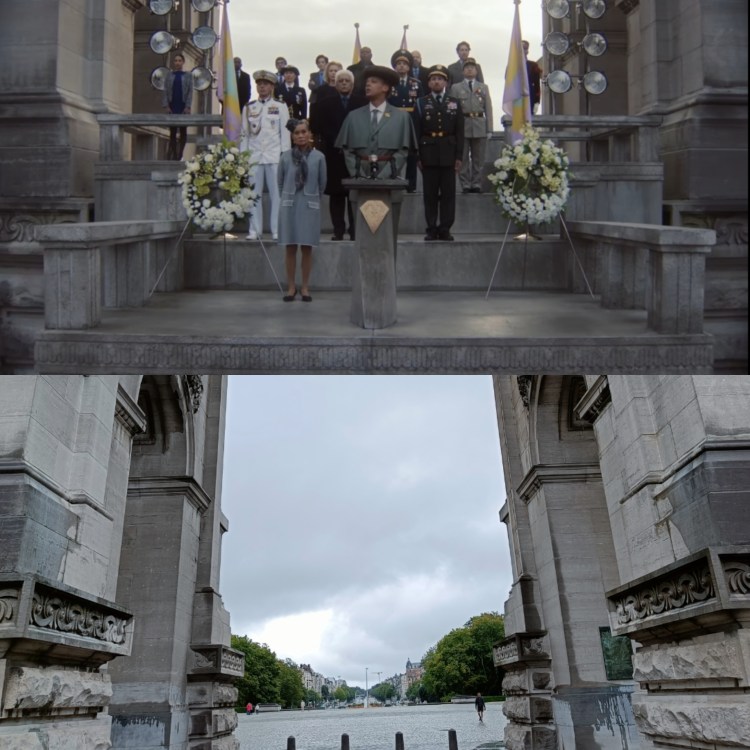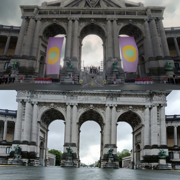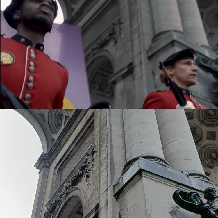 En face, on a ajouté devant le Parc du Cinquantenaire deux statues monumentales inspirées par les sculptures soviétiques de l’après-guerre. Vous pourrez remarquer d’autres plus petits détails modifiés à l’aide d’effets spéciaux, mais globalement c’est bien le monument du Cinquantenaire dans toute sa splendeur qui est visible à l’écran. Stromae se tient sur un piédestal maquillé pour ne pas dénaturer l’ensemble architectural.