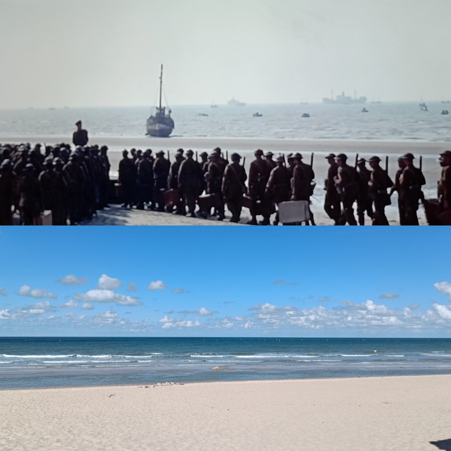 - De nombreuses troupes attendent sur la plage alors que les avions et batteries ennemis pilonnent régulièrement la zone. Cette plage, c’est Zuydcoote qui s’étire entre Bray-Dunes et Leffrinckoucke, on peut voir dans le film la silhouette de Dunkerque à l’horizon avec ses usines et cheminées.