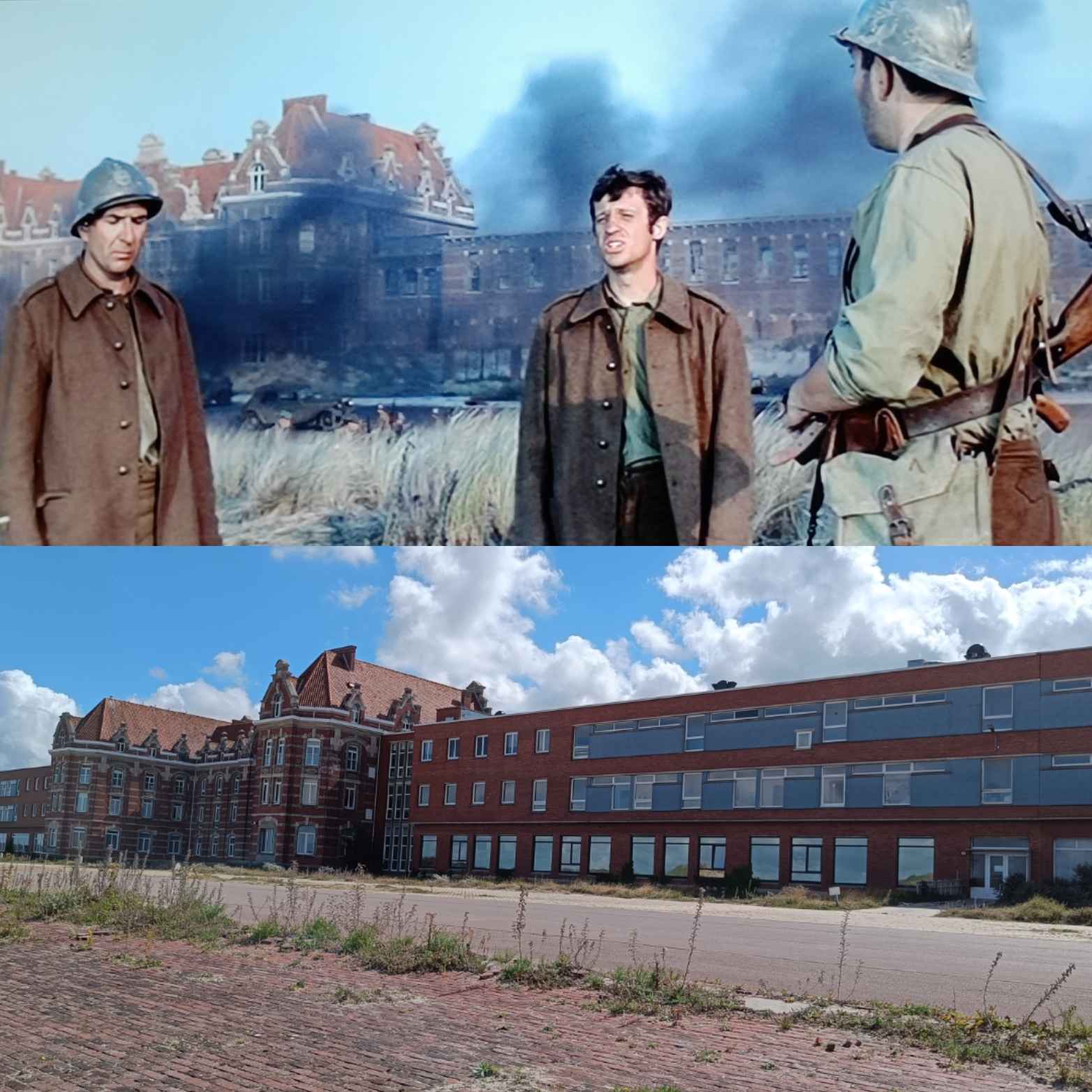 Julien retrouve ses potes dans les dunes devant le sanatorium, des tas de véhicules et de caisses de matériel militaire jonchent la plage et les dunes, un campement de fortune permet aux soldats de faire la popote et d’attendre la suite des événements, entre deux bombardements. Lorsque vous vous trouvez à cet endroit précis au 21e siècle, la côte a très peu changé depuis le tournage du film, on y retrouve les mêmes détails aux mêmes endroits, par chance très peu d’immeubles modernes sont venus détériorer les plages, sauvées sans doute par la présence de grandes dunes impossibles à construire. Si ce n’est l’immense hôpital qui surgit entre deux dunes tel un paquebot insubmersible.