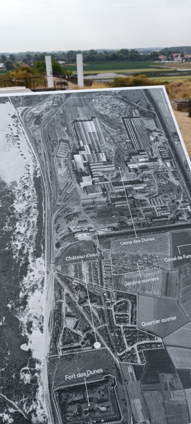 D’ailleurs, depuis les dunes qui entourent le Fort, une photo aérienne vous indique où diriger votre regard pour trouver les points d’intérêt de la zone. La voie ferrée est toujours là, mais elle n’est plus exploitée par la SNCF, une voie verte (un RAVeL comme on dit en Belgique) longe maintenant la voie.