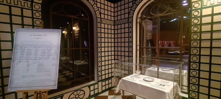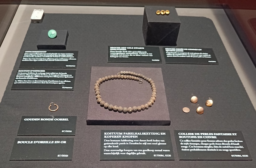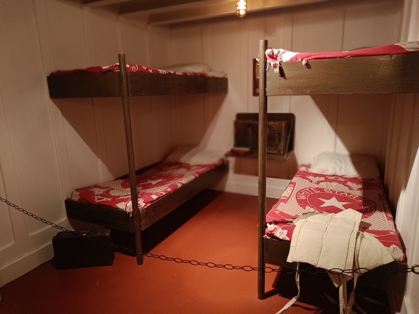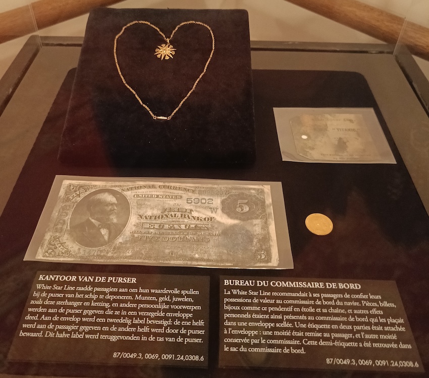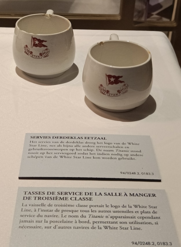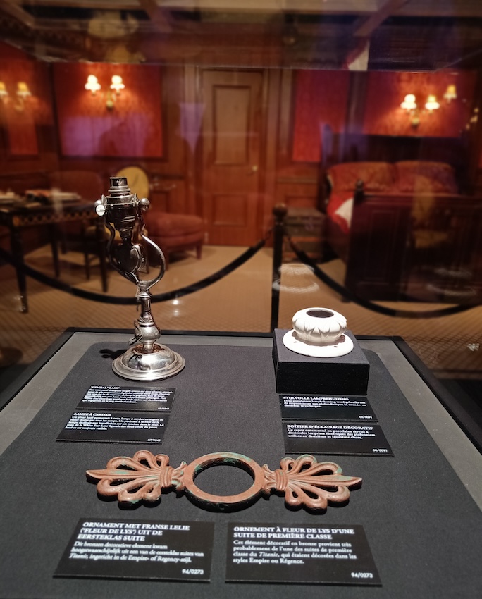 Divers objets retrouvés plus ou moins intacts dans les bagages ou les soutes du Titanic sont ici exposés : vaisselle, morceaux de décoration, bijoux, argent (essentiellement des dollars), vêtements… On apprend au fil de la visite que les carreaux des salles de bain étaient fabriqués par Villeroy & Boch Meetlach en Allemagne – la vaisselle allait de la plus fine porcelaine pour la première classe à la céramique fonctionnelle pour la troisième classe -, que les intérieurs des cabines des ponts supérieurs étaient décorés de bois précieux dans un style éclectique allant du style Empire à l’Art déco, que les salles de bain étaient alimentées en eau chaude et froide. Tout était fait pour que chaque passager.ère, même en classe économique, passe une agréable traversée. Des loisirs étaient proposés (piscine, squash, salle de gym, bains turcs pour les plus riches; jeux de cartes, échecs et bar pour les moins aisés) et les menus des restaurants étaient copieux pour la troisième classe, abondante pour la seconde et gargantuesque pour la première classe (jusqu’à 13 plats différents au cours d’un même repas !).