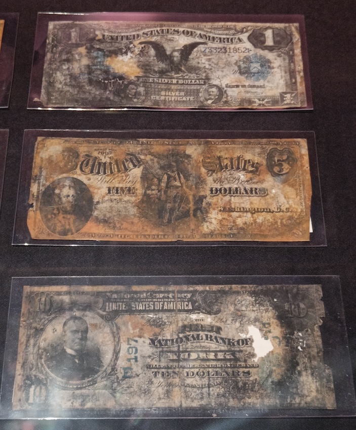 Divers objets retrouvés dans les bagages du Titanic : bijoux, billets de banque (dollars américains) et pièces de monnaie