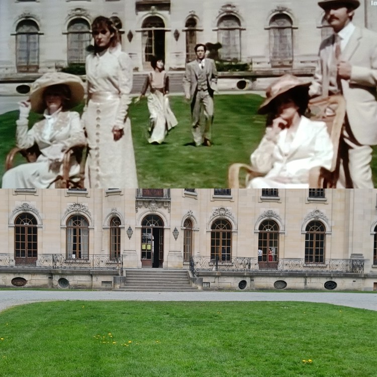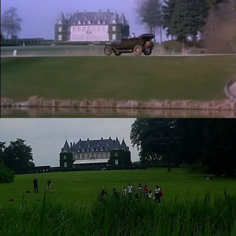 Balades à vélo ou à pied, traversées en calèche ou en automobile nous donnent encore à voir au fil des scènes l’étendue et la beauté du parc. Certains arbres toujours en place sont d’excellents repères pour les « cinétouristes », comme ces trois arbres au milieu de la pelouse que vous pouvez voir sur la photo ci-dessous prise en 2021, 33 ans après la sortie du long métrage.