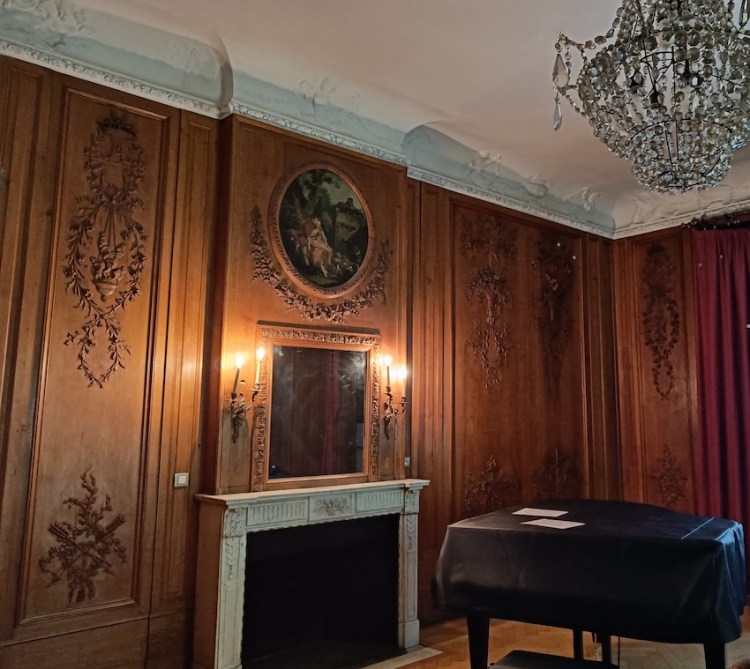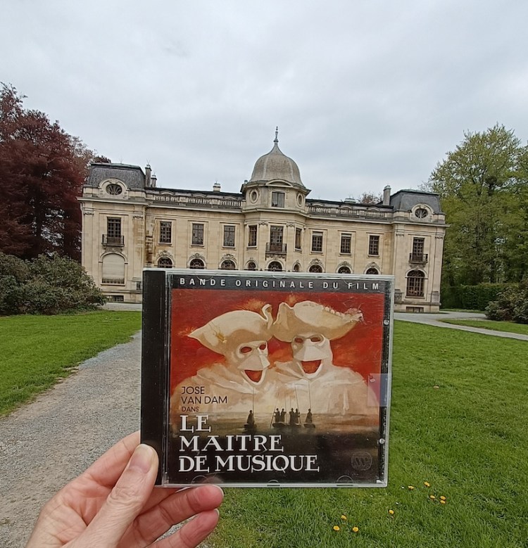 Le Maître de Musique s’ouvre sur un récital du célèbre baryton Joachim Dallayrac, interprété par José van Dam, accompagné par la pianiste Estelle Fischer (Sylvie Fennec). Cette séquence a été tournée dans le théâtre du château de Chimay. Datant de 1863, la salle à l’italienne est inspirée du théâtre du château de Fontainebleau, elle est constituée de deux balcons et d’une loge princière. Le plafond peint représente le Paradis. La salle est inscrite sur la liste du patrimoine exceptionnel de Wallonie.