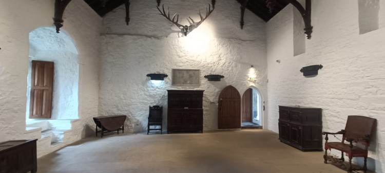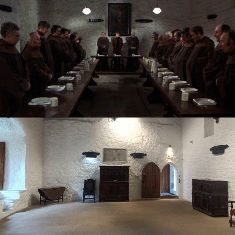 Si l’île en question est en fait Sherkin Island au large du comté de Cork pour le tournage en extérieur, la plupart des intérieurs ont été filmés au château de Cahir, principalement dans le grand hall et à l’étage de celui-ci, on peut effectivement imaginer un ordre monastique prendre ses repas dans cette grande salle aux murs blancs modestement meublée.