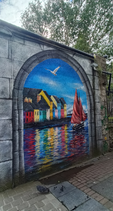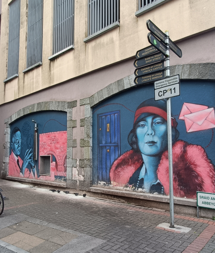 Galway est une autre ville où les artistes peuvent s’en donner à cœur joie : commandes pour animer les façades des boutiques ou invitations à représenter les emblèmes de la ville portuaire; le bleu est la couleur dominante ici. Le port avec ses maisons bariolées, les barques de pêcheurs et le macareux moine, l’oiseau marin à l’allure amusante, sont à retrouver au détour des rues de la ville. Friz quant à lui met en lumière James Joyce et son épouse Nora Barnacle, celle-ci était de Galway, elle était la muse du fameux écrivain irlandais.