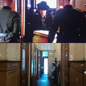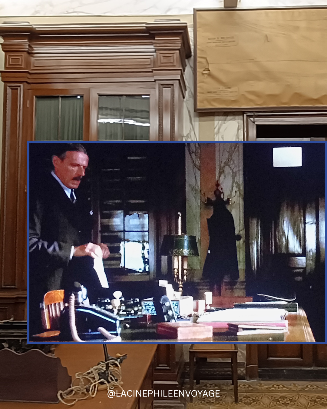 Deux scènes principalement se passent dans le couloir d’entrée qui communique entre le bureau directorial et le bureau de paie du musée. En premier lieu, les habitants de Bussy (Marville pour les prises de vue extérieures, on s’en souvient) sont sommés de venir remettre leurs armes personnelles – des fusils de chasse essentiellement – auprès de l’occupant. On peut voir plusieurs des personnages principaux faire la file et se croiser ici dans le couloir où un soldat allemand installé à une table au niveau du bureau de paie tient un registre. Lors de la seconde séquence, une table placée au niveau de l’escalier qui mène à l’étage est le point d’arrêt de la Vicomtesse de Montmort (Harriet Walter) qui doit y montrer le contenu de la valise qu’elle a apportée à son époux, fait prisonnier.