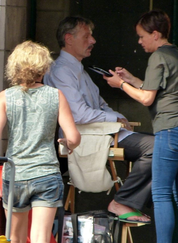 On peut voir sur les photos ci-dessus les tongs vertes portées par Lambert Wilson pendant qu’il se fait retoucher le maquillage. Tourné en plein été par forte chaleur, on peut comprendre cette liberté prise avec son costume à partir du moment où on ne voit pas ses pieds dans la scène ! Sur la deuxième photo, on peut le voir discuter avec le réalisateur britannique Saul Dibb (l’acteur étant parfaitement anglophone). Sur la troisième image, l’acteur allemand Heino Ferch en costume, et sur le dernier cliché, Lambert Wilson dans le bureau directorial à travers l’écran de contrôle de la caméra principale.