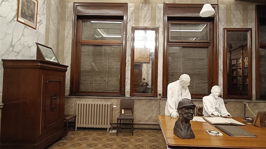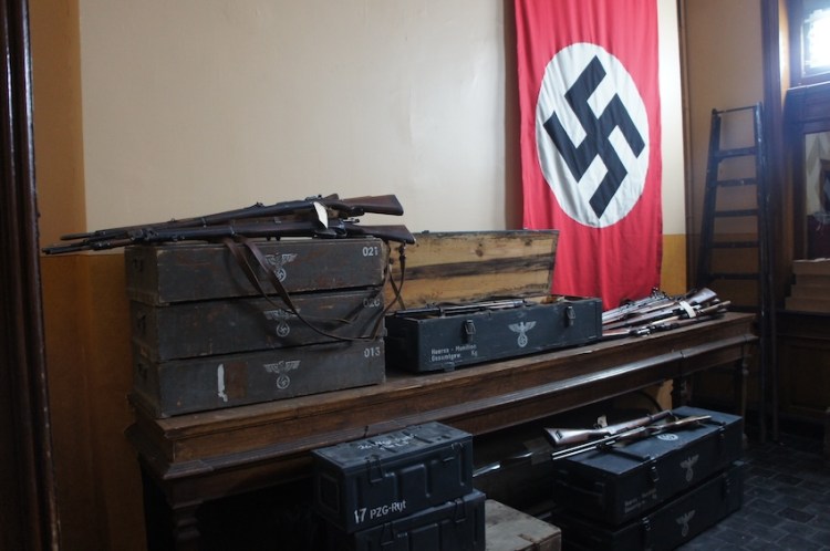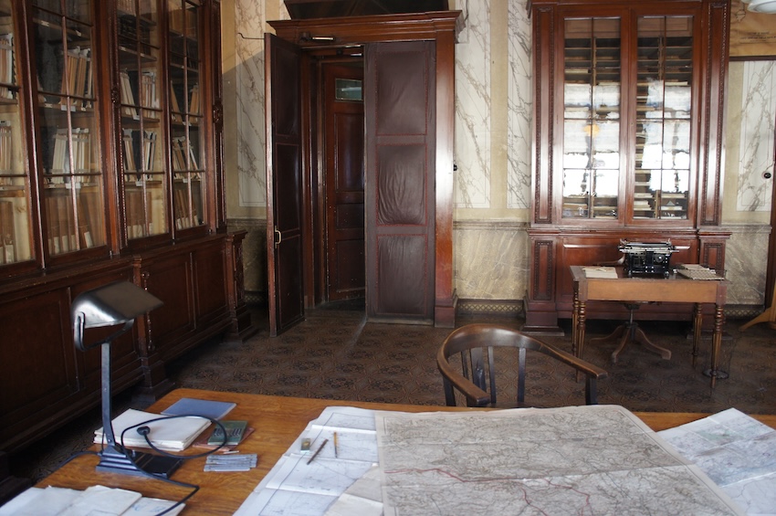 Sur les clichés ci-dessous pris pendant le travail préparatoire avant le tournage, on peut voir le boulot des décorateurs à l’œuvre dans les bureaux. Téléphones, documents, armes, drapeaux nazis et portrait de Hitler sont venus transformer les diverses salles du musée.