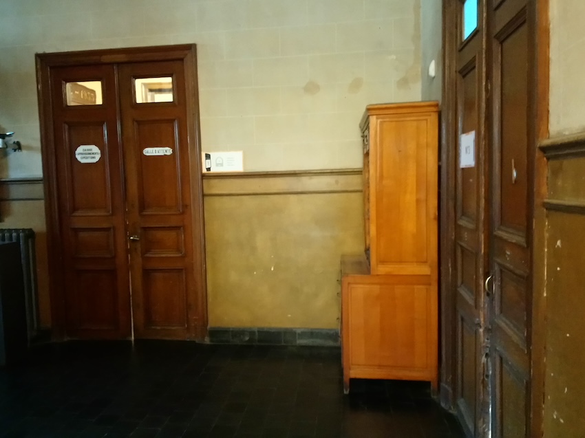 En effet, le personnage joué par Lambert Wilson a été arrêté en punition d’un incident qui a eu lieu précédemment, il va être condamné à mort en guise d’exemple. Après avoir subi un interrogatoire, il a droit à son dernier repas en compagnie de son épouse. Un dernier échange qui a été tourné dans un endroit du musée qui n’est pas ouvert au public puisqu’il s’agit d’un petit bureau sous pente à l’étage qui est occupé par le personnel. On peut reconnaître sur la photo ci-dessous les étagères en bois que l’on voit dans le film. Le maire est assis à une table tandis que sa femme qui vient lui dire adieu est assise en face de lui pour une séquence classique en champ/contre-champ. Vous pouvez remarquer aussi que les murs ont été repeints depuis le tournage en 2013. D’ailleurs la lucarne du toit, qui est maintenant occupée par un velux moderne, avait été camouflée par les décorateurs du film, ils avaient fabriqué une fenêtre sur mesure à encastrer afin qu’on n’y voit que du feu.