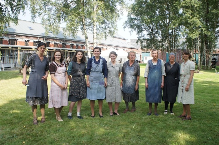 Sur cette jolie photo où figurent quelques-unes des figurantes du film, prise dans la cour des ateliers du musée de Bois-du-Luc, on peut voir les nombreux arbres qui ont disparu depuis (ils menaçaient la structure des bâtiments proches). Lorsque vous visitez le musée actuellement, cette zone est maintenant dénudée, on y retrouve uniquement la pelouse.
