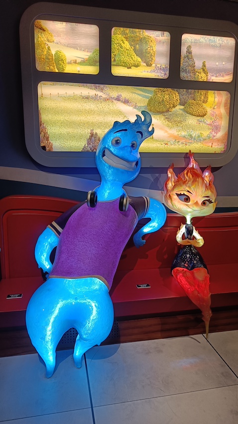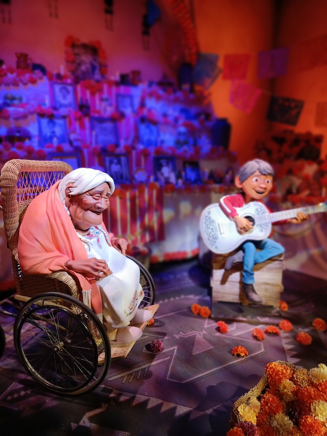 Le Monde de Nemo, Ratatouille, Coco, Toy Story, Monstres et Cie, Cars, Luca, Vice-Versa et Elémentaire s’enchaînent dans le désordre, une introduction au début de chaque salle donne quelques faits et anecdotes sur chacun des longs métrages et ensuite libre à vous de vous balader et de vous arrêter sur les détails des décors : la chambre de Andy aux meubles si grands que nous nous retrouvons en fait à la taille des jouets; la joyeuse maisonnée de Coco avec son abuela qui nous fait vivre la fête des morts comme si on y était; l’installation technologique de Monstres et Cie avec les portes qui mènent aux chambres des enfants pour récolter leurs cris; le poste de commande des émotions dans Vice-Versa, dommage qu’on ne puisse toucher aux manettes et aux globes lumineux (les souvenirs) !